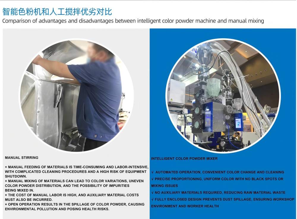 100KG/JAM"Pencampuran Serbuk Warna Cerdas" dapat diintegrasikan secara mulus dengan sistem pengumpanan terpusat, sistem pengangkutan terpusat, dan sistem penanganan material otomatis. Pengaduk Warna Plastik dilengkapi dengan sensor penimbangan presisi tinggi, yang menjamin keseragaman proses pencampuran dan konsistensi warna, serta mendukung proporsi otomatis bubuk multi-komponen dan aditif.